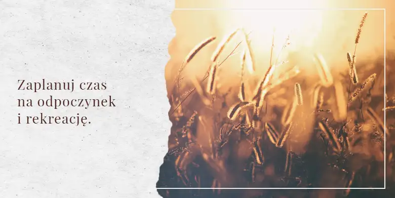 Księga Wyjścia 34,21Jednym z najlepszych sposobów, by utrzymać właściwą perspektywę na to, co naprawdę ważne, jest planowanie czasu na odpoczynek i rekreację. Słowo rekreacja oznacza z ang. re-create – „odtworzyć”, czyli na nowo naładować baterie fizyczne, duchowe, emocjonalne i towarzyskie. Odpoczynek i rekreacja odnawiają kreatywność, dostarczają paliwa marzeniom i wnoszą równowagę do twojego świata. Często osoby najbardziej przez nas podziwiane to ludzie o zaburzonych relacjach społecznych i rodzinnych. Gdyby na przykład niektórych mówców pozbawić pulpitu, a niektórych dyrektorów pozbawić tytułu dyrektora generalnego, straciliby grunt pod nogami. Powiedzmy sobie szczerze, przydałaby im się pomoc terapeuty. Grają tylko na jednej strunie swoich skrzypiec – pracy. Bez niej nie wiedzą, jak żyć! W Biblii czytamy: „Bóg (…) odpoczął (…) od wszelkiego dzieła, które uczynił” (Rdz 2,2).