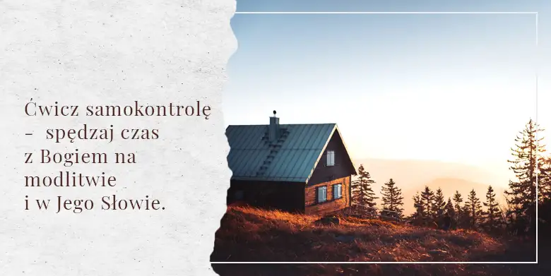 2 List do Tymoteusza 1,7Aby być szczęśliwym w życiu, musisz zacząć robić właściwe rzeczy, a przestać robić złe. Jedną z nich jest przestać mówić, że nad sobą nie panujesz. Samokontrola jest wyborem i im częściej ją wybierasz, tym staje się silniejsza. A oto najlepsza część: moc samokontroli pochodzi od Boga, nie od ciebie, bo „Duch daje nam moc, miłość i panowanie nad sobą”. Dzieje się to automatycznie, gdy spędzasz czas z Bogiem na modlitwie i w Jego Słowie. „Zwróć uwagę na me słowa, mój synu, nakłoń ucha do moich słów! Nie spuszczaj z nich swojego wzroku, strzeż ich głęboko w swoim sercu. Bo są życiem dla tych, którzy je znajdują i lekarstwem dla całego ich ciała. Najczujniej ze wszystkiego strzeż swojego serca, bo z niego tryska źródło życia!” (Prz 4,20-23).